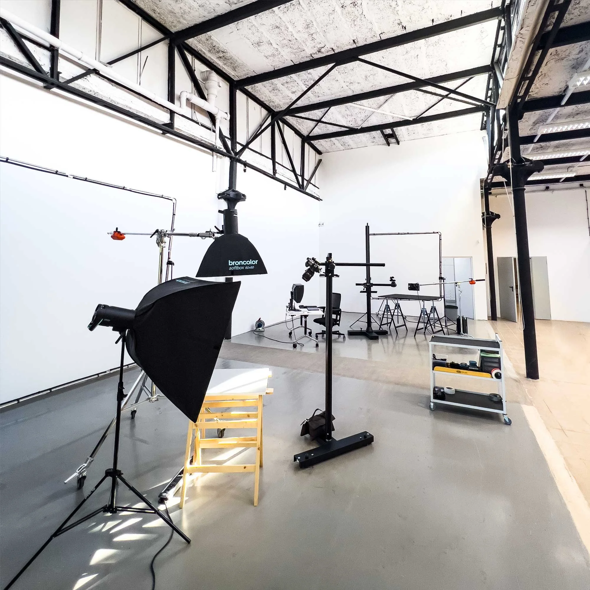 Posiadamy profesjonalny sprzęt firmy Broncolor, gwarantujący niezwykłą niezawodność. Dzięki stabilności mocy oraz temperatury barwowej oświetlenie każdego zdjęcia jest identyczne. Lampy posiadają ultrakrótki czas błysku, co daje możliwość zamrożenia najbardziej dynamicznych scen. Możliwość sterowania lampami poprzez aplikację na telefon znacząco przyśpiesza i ułatwia pracę. W studiu fotograficznym znajduje się również wiele statywów Manfrotto i Avanger umożliwiających dowolne ustawienie oświetlenia oraz elementów scenografii.