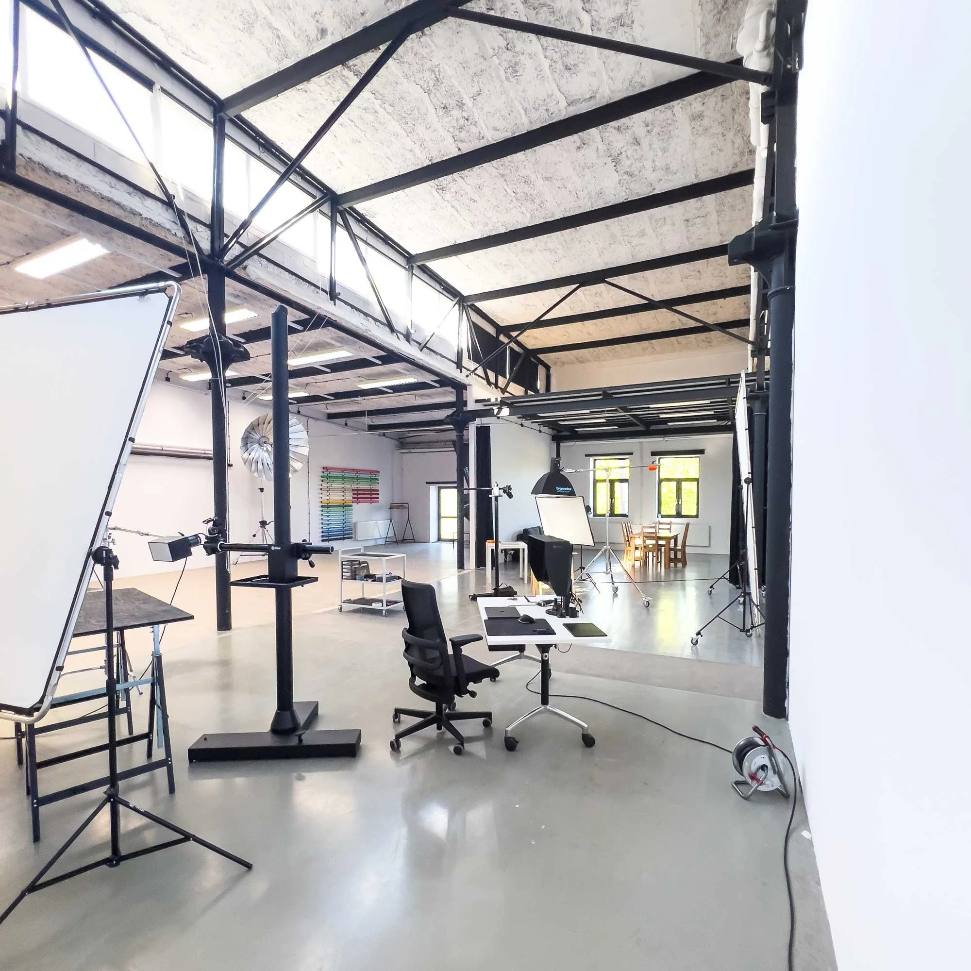 Przestronna powierzchnia studia fotograficznego do dowolnej aranżacji planów zdjęciowych.